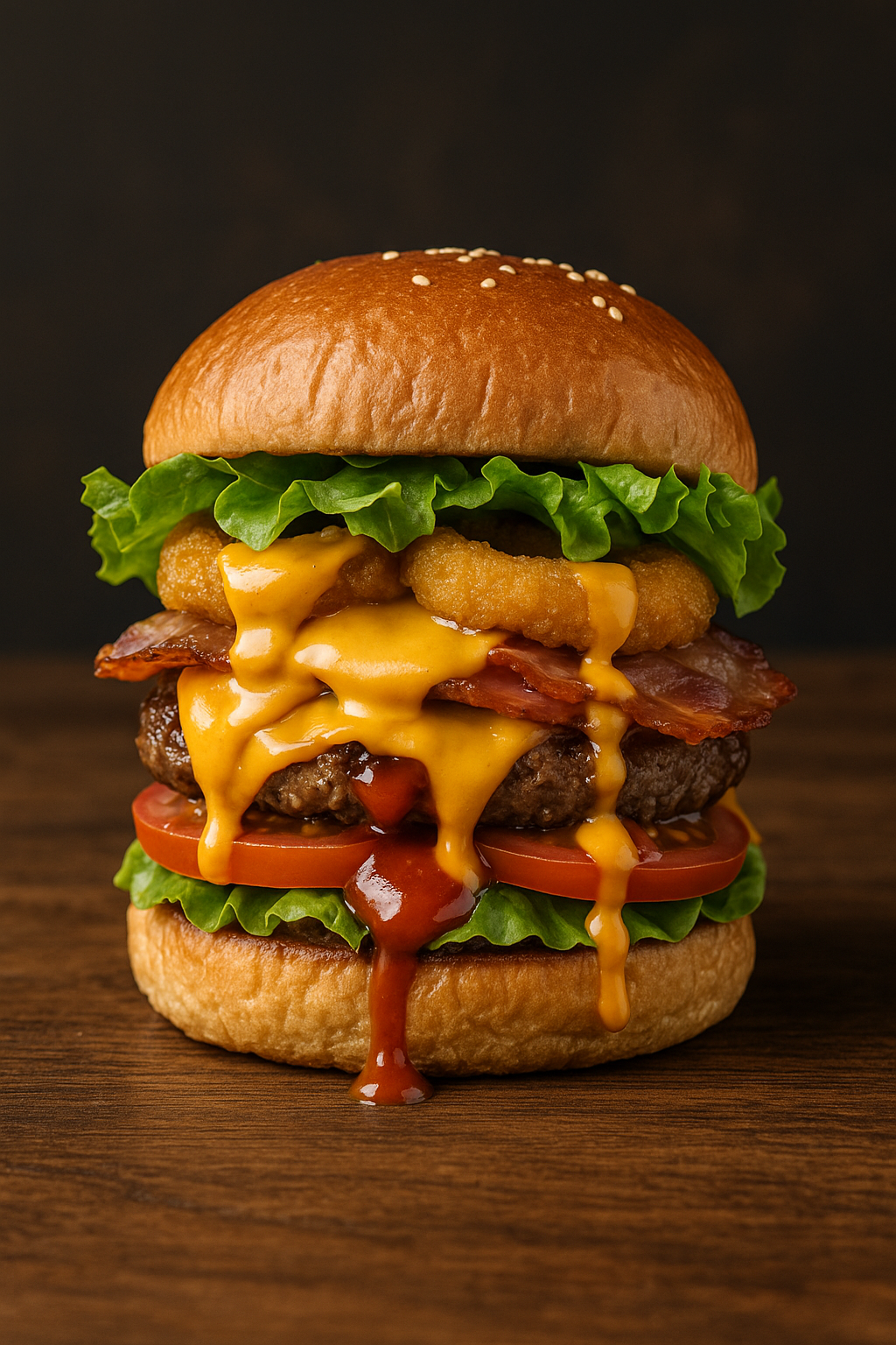 sla, 180gram real irish beef, bacon, onion rings, bbq sauce, cheese, pittige sauce